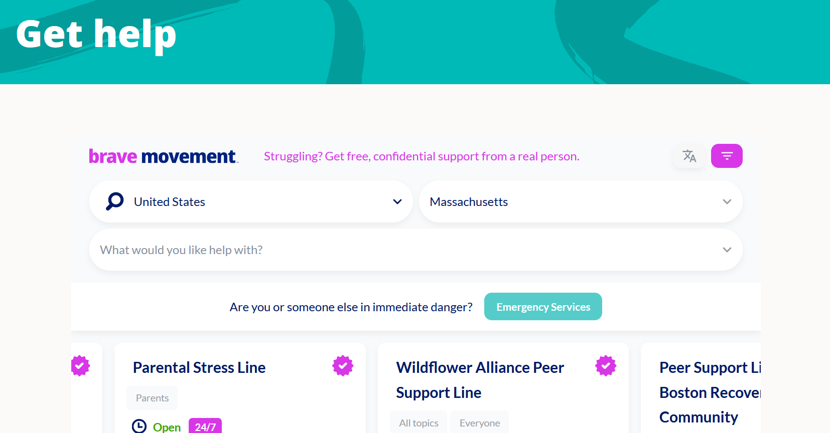 The Brave Movement manages a “Get Help” tool to quickly find support lines and organizations all around the world.